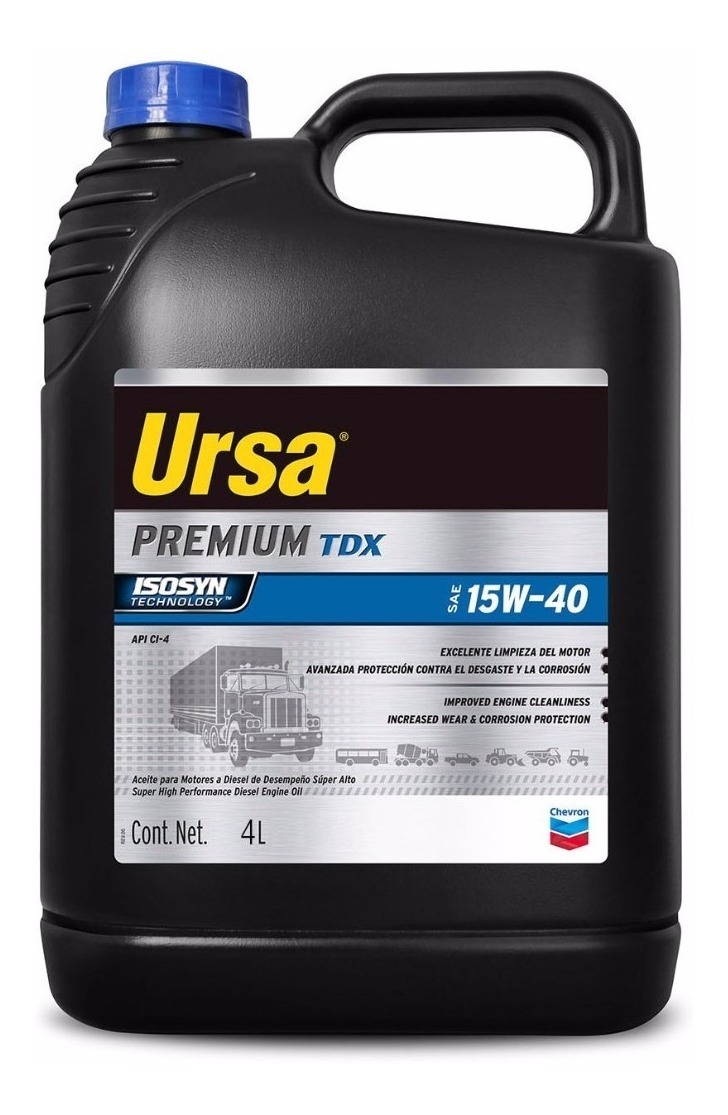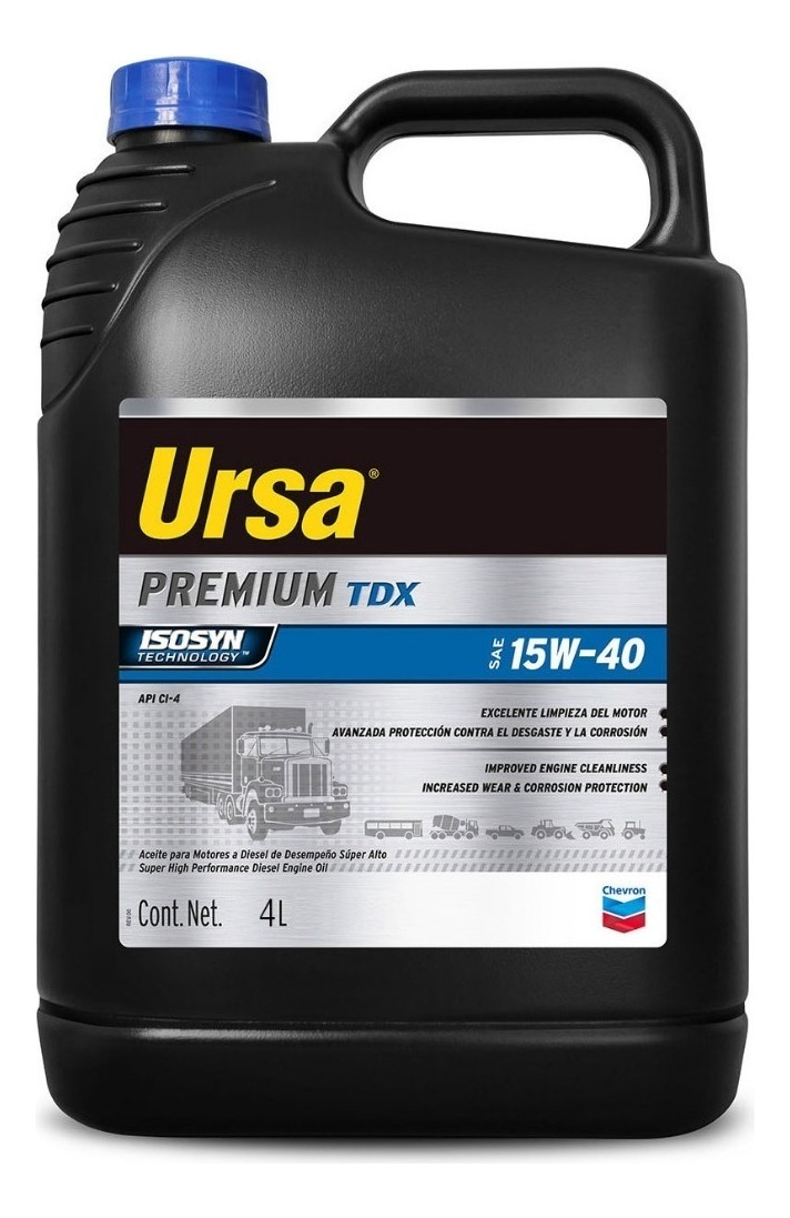 Ursa Premium TDX SAE 15W40, formulado con tecnología ISOSYN®, es un aceite multigrado SAE 15W-40 y grado de desempeño API CI-4 / ACEA E7 recomendado para motores diesel de aspiración natural o turbo alimentados, incluyendo los equipados con recirculación de los gases de escape (EGR).