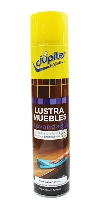 Lustra Muebles en Aerosol Lavanda JúpiterLustra muebles Júpiter hogar protege los muebles, da brillo, quita el polvo y deja una frescura exquisita. La película protectora que genera Lustra muebles Júpiter hogar mantiene con brillo y protección durante mas tiempo a tus muebles.- Contenido: 360ml.Modo uso:- Agita bien antes de usar.- Para mayor efectividad, rocie un paño y repase la superficie.- En caso de aplicarlo directamente sobre la superficie, hágalo teniendo el pulverizador unos 20cm alejado de la superficie.