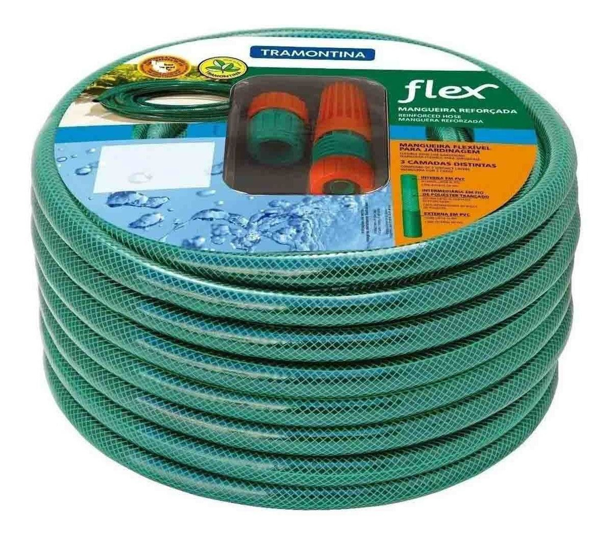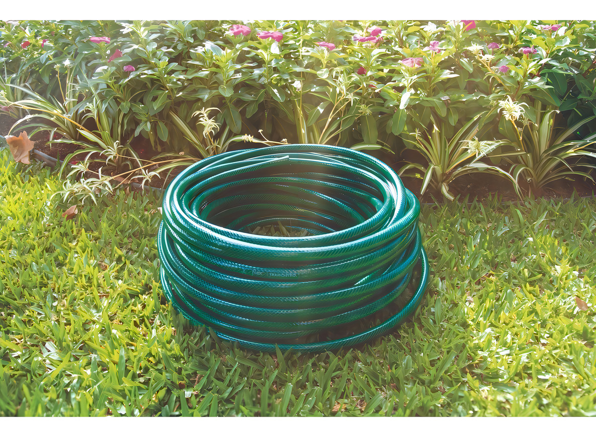 La manguera flexible de PVC verde de 3 capas Tramontina, de 1/2 pulgada y 20 m, es ideal para regar y mantener el cuidado de su jardín. Tiene 20 metros de largo y es superresistente, con 3 capas diferentes: interna de PVC, intermedia de hilo de poliéster trenzado y externa de PVC. Este producto es adecuado para su uso con una presión de agua de hasta 10 bar [145 psi] y temperaturas de hasta 50 °C.