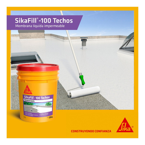SikaFill®-100 Techos, es la nueva Membrana Líquida elastomérica, antialgas, antihongos y con gran poder cubritivo. SikaFill®-100 Techos, conforma un recubrimiento elástico continuo e impermeable con una muy buena adherencia sobre la superficie.