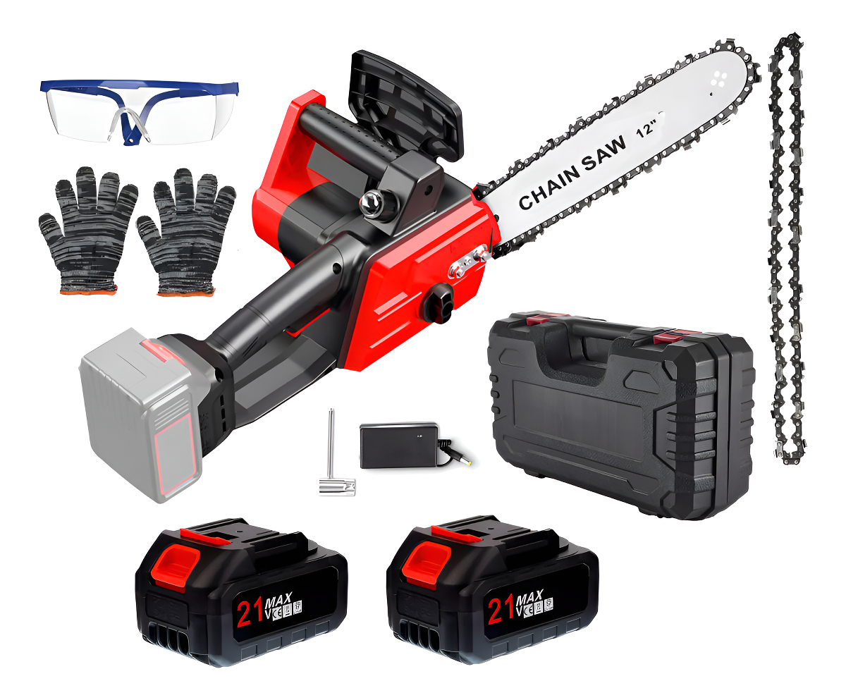 Mini Motosierra de 12 Pulgadas con 2 Baterías, 2 Cadenas, 1 Espada, Maletín, Guantes, Lentes y Cargador.