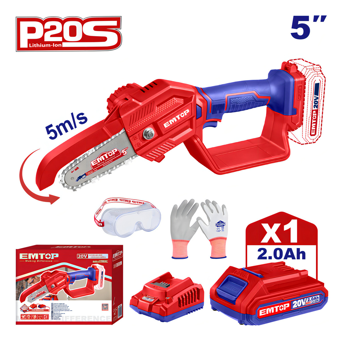 La Mini Motosierra a Batería 5 pulgadas 20 V Emtop Elga20581 es la herramienta ideal para quienes buscan eficiencia y comodidad en sus tareas de jardinería y mantenimiento. Con un diseño compacto y ligero, esta motosierra permite un manejo sencillo y preciso, facilitando el corte de ramas y pequeños troncos con facilidad.
