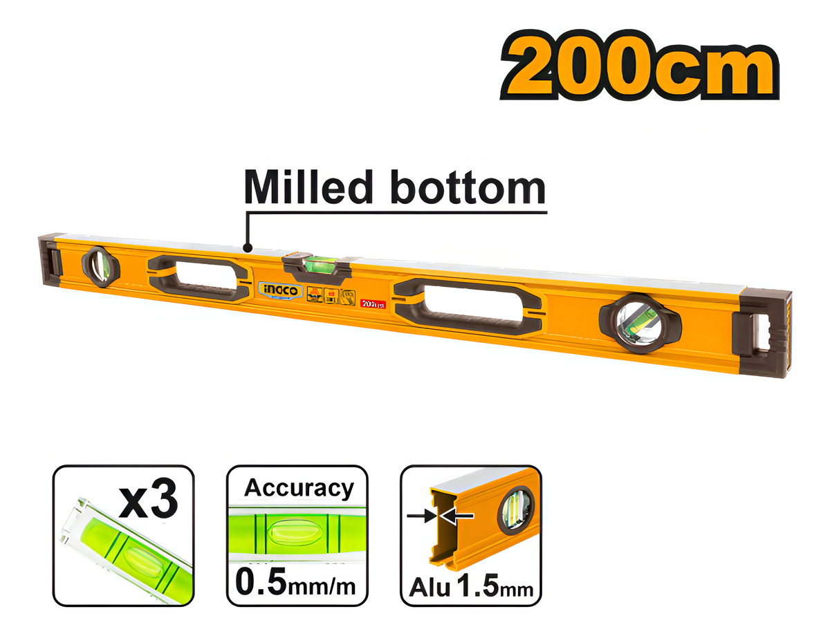 El Nivel Ingco De 3 Burbujas Industrial 200cm es fácil de usar y leer, con burbujas claras y marcas de medición precisas. Su tamaño y peso facilitan su manejo y transporte, convirtiéndolo en una herramienta indispensable para cualquier proyecto de construcción o renovación.