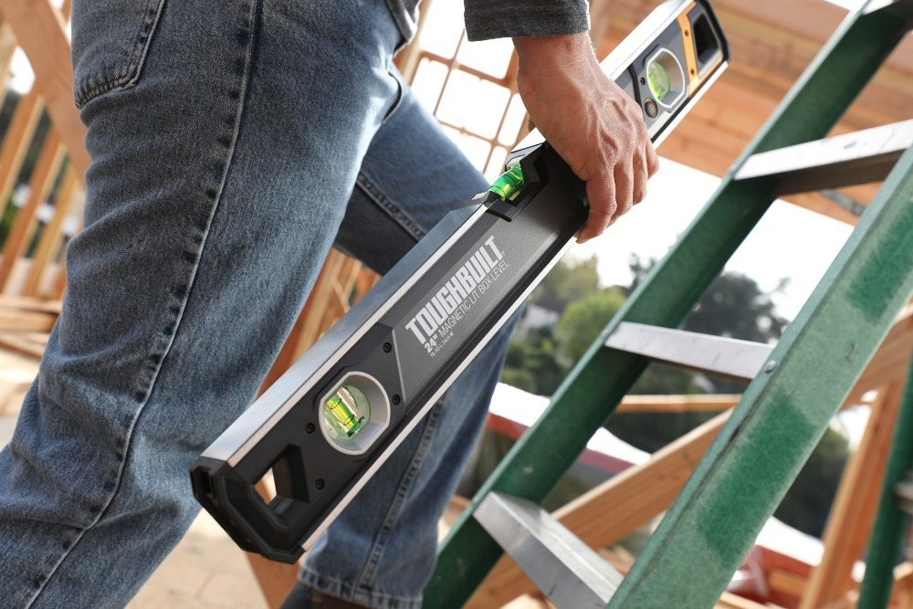 Este nivel de torpedo magnético iluminado ToughBuilt de 24 pulgadas cuenta con viales iluminados por LED para una lectura sencilla.