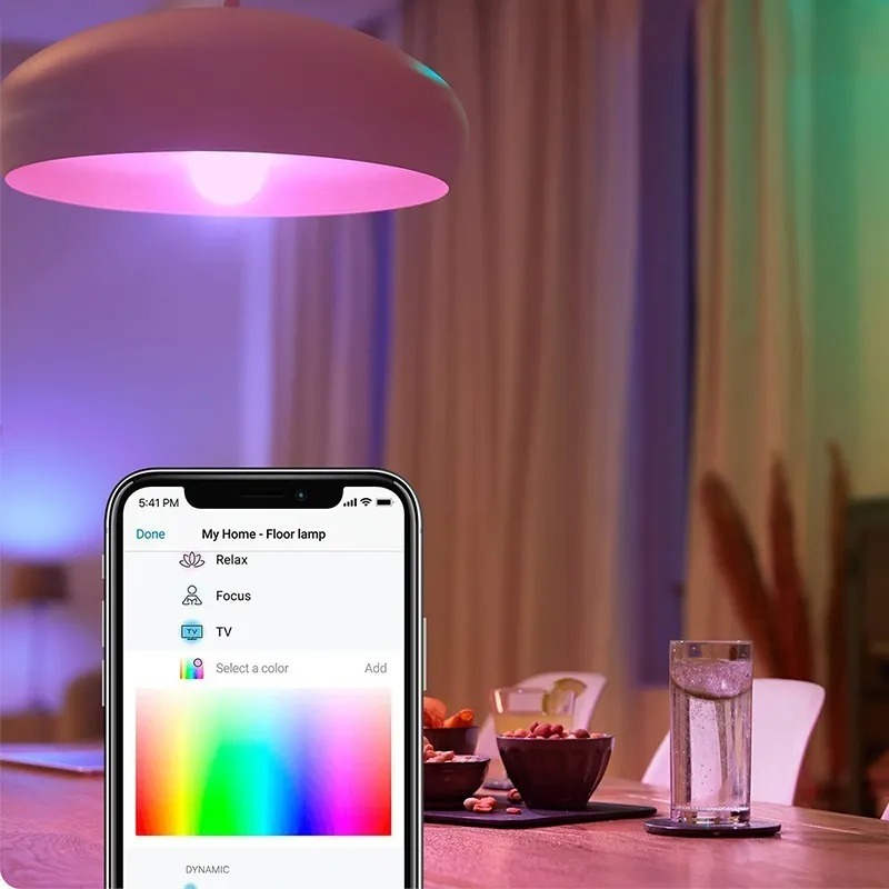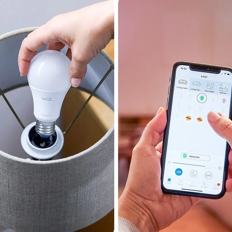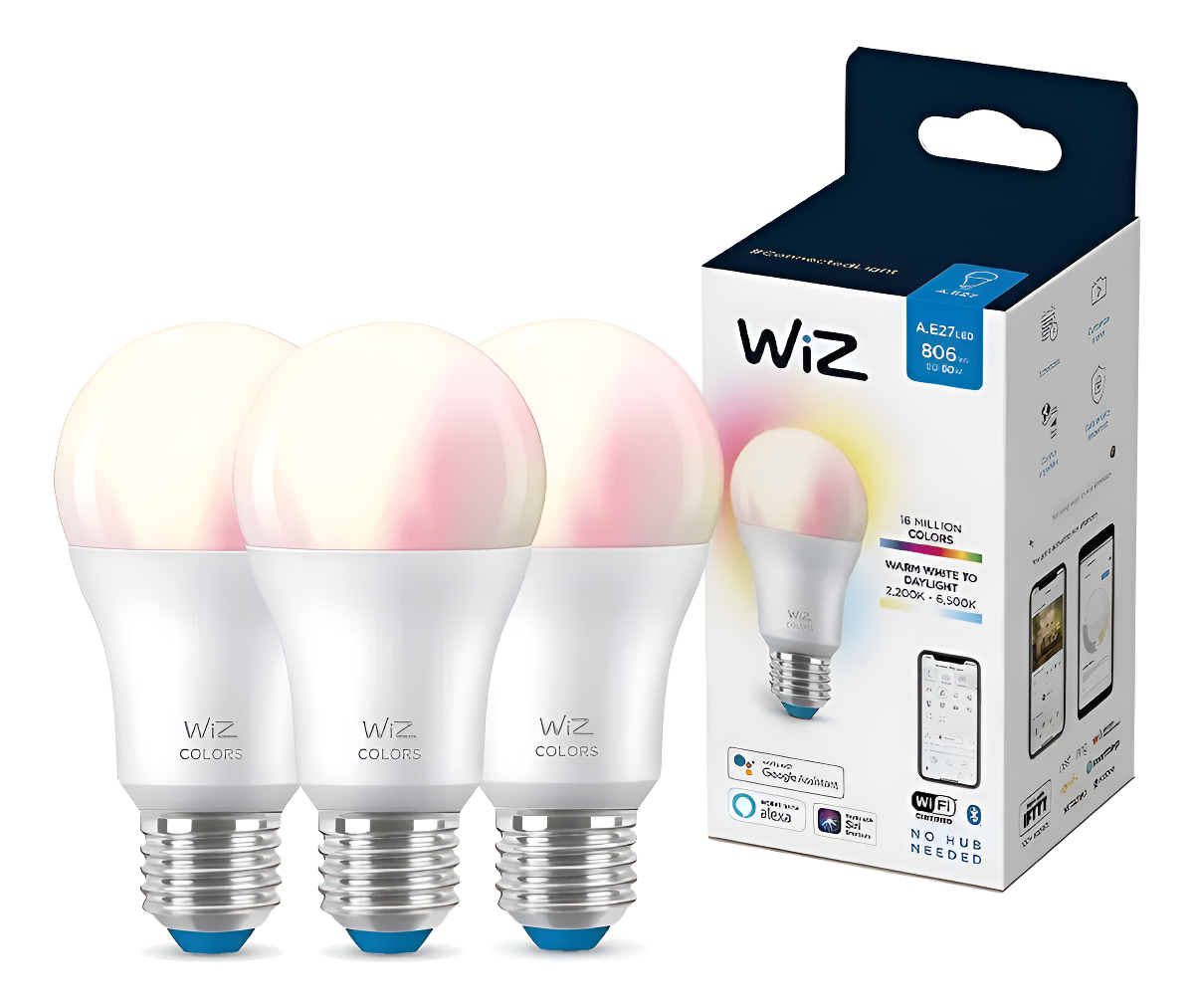 Pack de 3 lámparas bulbo LED WIFI marca WIZ modelo Full Color WiZ LED, controladas en forma remota desde cualquier lugar a través del teléfono o tablet por WIFI, simplemente bajando la aplicación luego de instalar el producto. Iluminación inteligente que ofrece soluciones innovadoras y sencillas para el día a día: