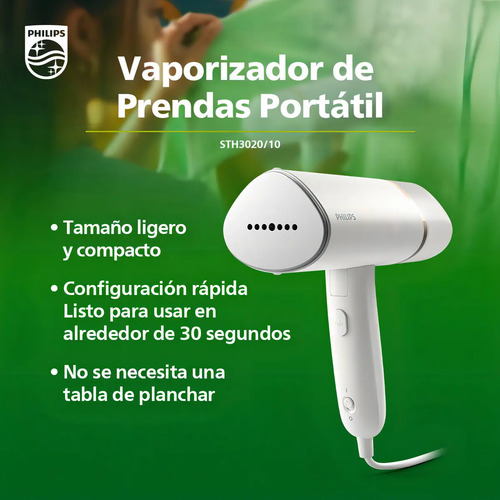 La Plancha a Vapor Vertical Philips STH3020/10 es un producto de alta calidad de la reconocida marca Philips. Este electrodoméstico de color blanco presenta un diseño ligero, compacto y plegable, lo que facilita su almacenamiento y transporte. Su tanque de agua es desmontable y tiene una capacidad de 120 ml, lo que permite hasta 20 minutos de vapor continuo. Esta plancha está lista para usar en tan solo 30 segundos, lo que la hace ideal para aquellos que necesitan planchar sus prendas rápidamente. Además, su función de vapor elimina el 99.9% de las bacterias, refrescando las prendas, eliminando olores y prolongando la vida útil de las mismas. Este modelo es perfecto para uso doméstico y cuenta con la función de planchado vertical. A pesar de ser una plancha a vapor, no es una estación de planchado. Como beneficio adicional, la Plancha a Vapor Vertical Philips STH3020/10 incluye una funda para guardarlo fácilmente. Este producto es una excelente opción para mantener tus prendas siempre impecables.