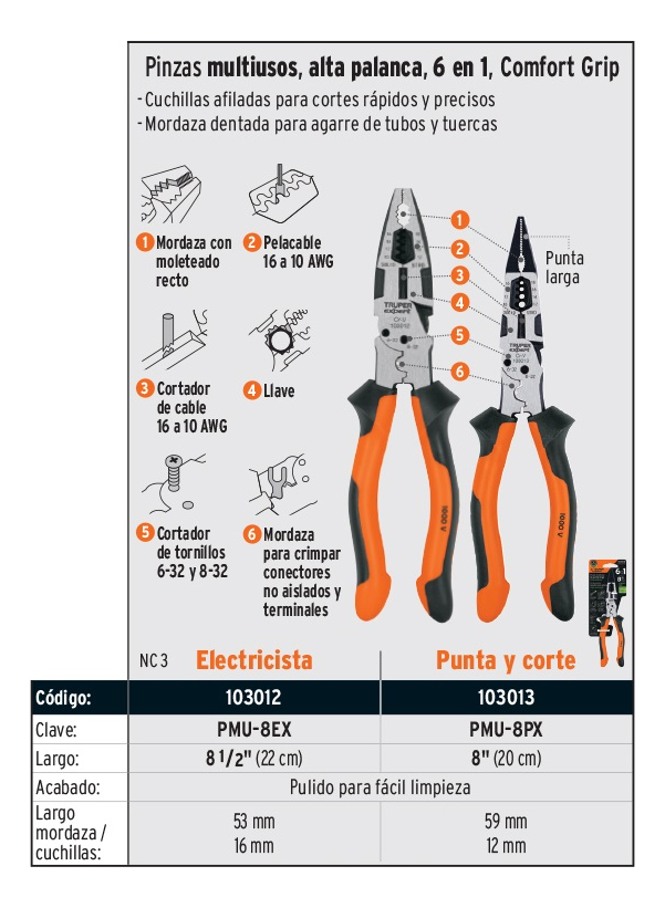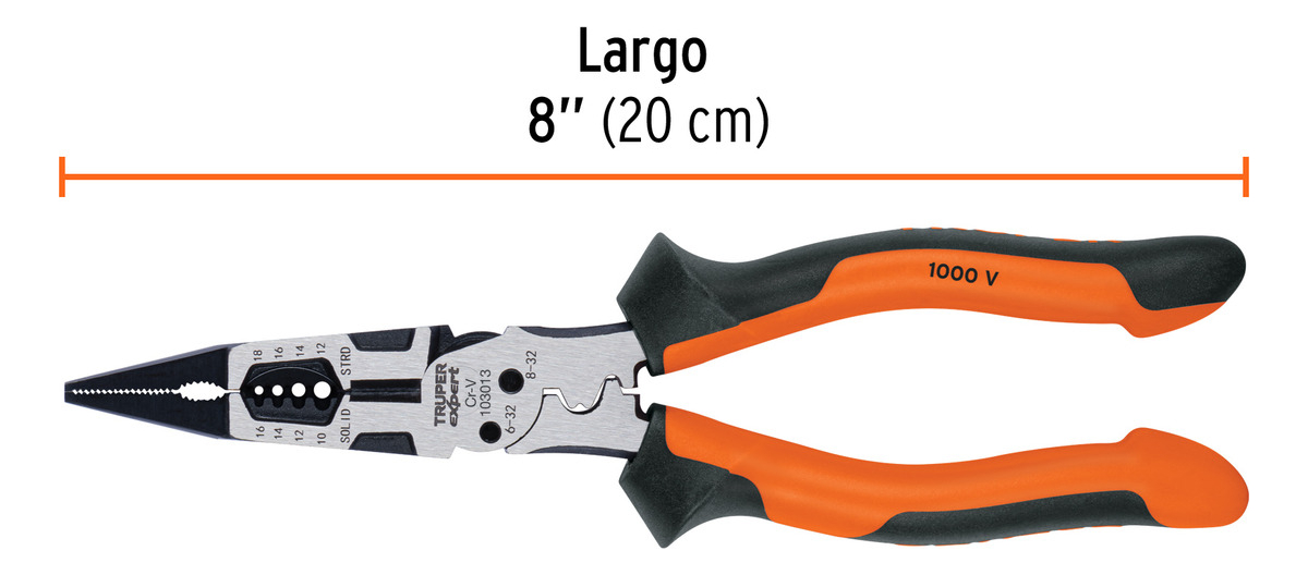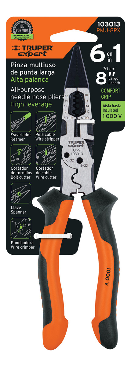 Pinza Multiuso 8 Punta Larga, Comfort Grip, Truper 103013