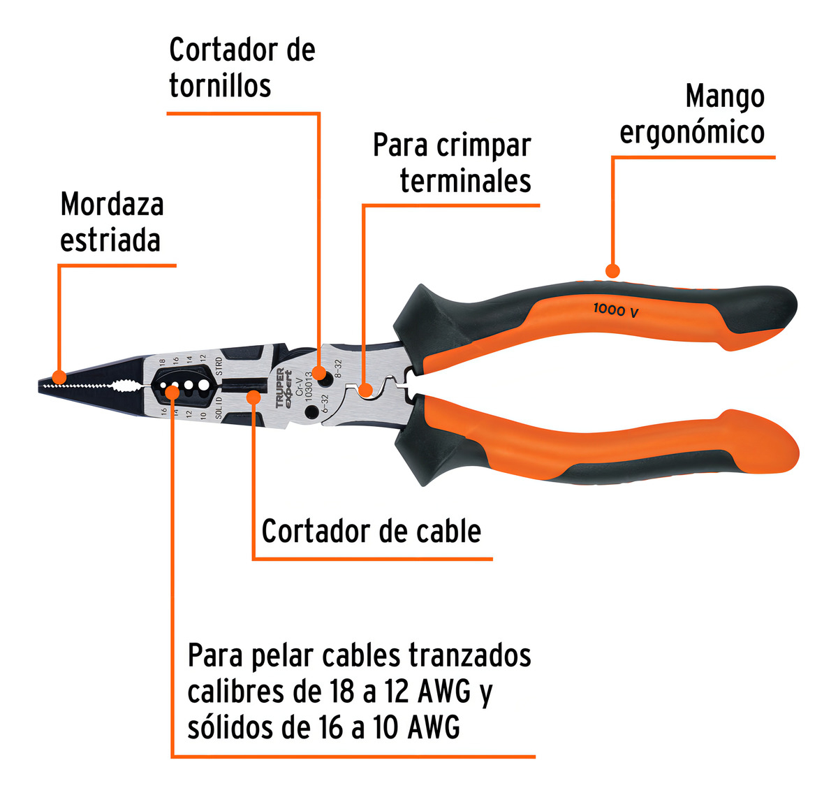 -Para pelar cables trenzados calibres de 18 a 12 AWG y sólidos de 16 a 10 AWG
