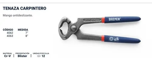 Esta tenaza de carpintero de la marca Bremen es conocida por su calidad y rendimiento confiable. El mango antideslizante proporciona un agarre seguro y cómodo, lo que permite un control total durante el uso. Esto es especialmente útil en trabajos que requieren un manejo cuidadoso y preciso.