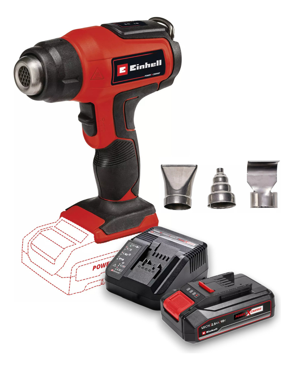 La pistola de aire caliente con batería de Einhell TE-HA 18 Li-Solo es un flexible miembro de la familia Power X-Change de alta calidad. La potente pistola de aire caliente está equipada con dos escalones de temperatura: Para la deformación suave de plástico en la construcción de modelos, para la retirada de láminas adhesivas o también para laca, restos adhesivos y capas de pintura antiguas. En la pantalla LED se puede reconocer el escalón de temperatura seleccionado de un vistazo. La protección frente a sobrecalentamientos confiere un funcionamiento seguro. Boquillas de chorro ancho y boquilla de reflector incluida en el alcance del envío. Gancho metálico plegable. La entrega no incluye batería ni cargador.