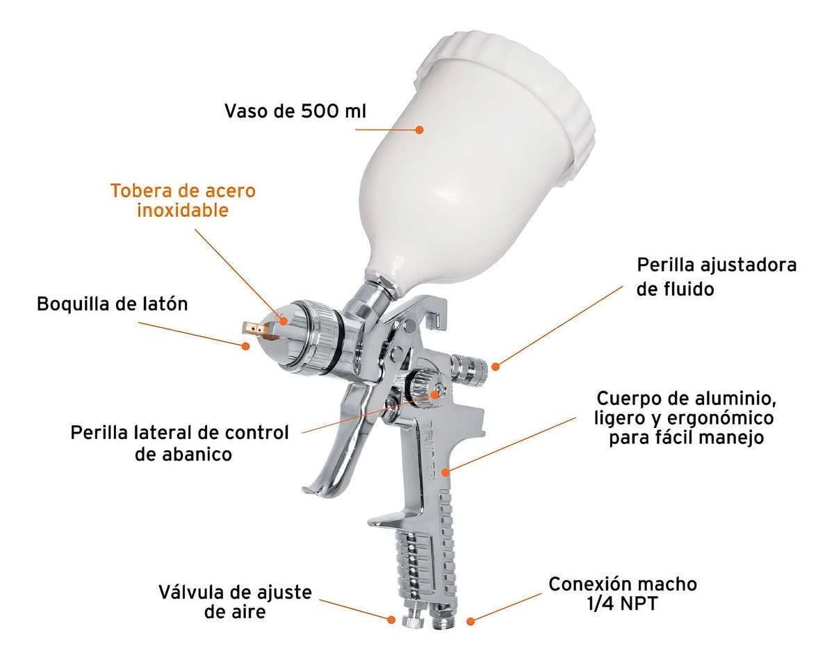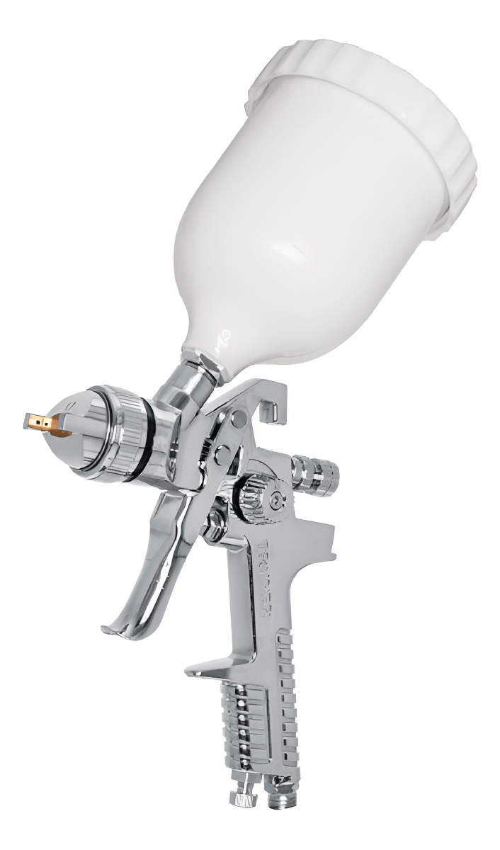 El sistema de pulverización de la pistola HVLP trabaja con alto volumen de aire y baja presión, brindando mayor eficiencia: gran cantidad de pintura sale de la boquilla e impacta en la superficie a pintar. Además, la baja presión reduce la atomización de la pintura, con lo que se obtiene menos exceso de pulverización, residuos y contaminación.