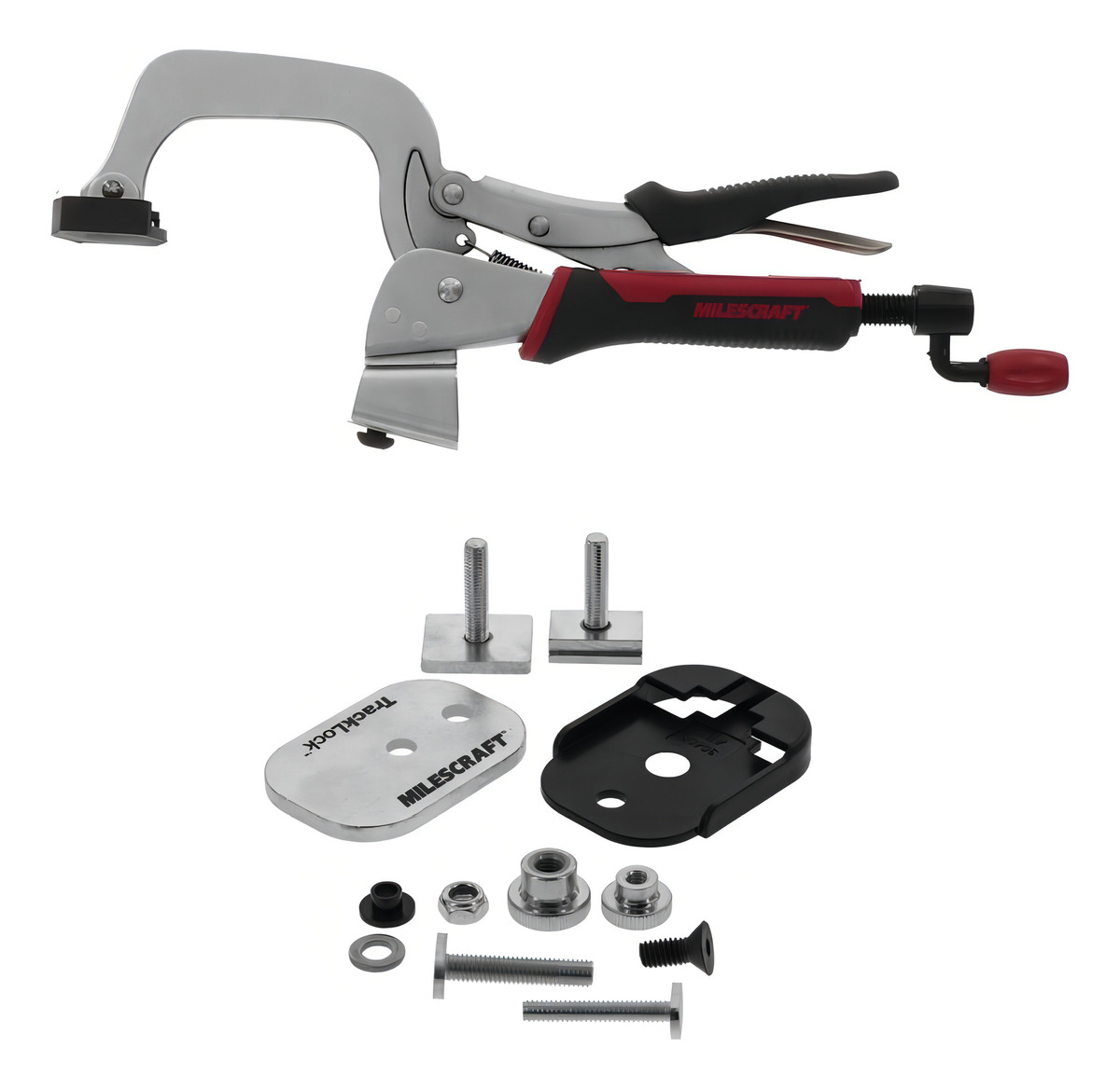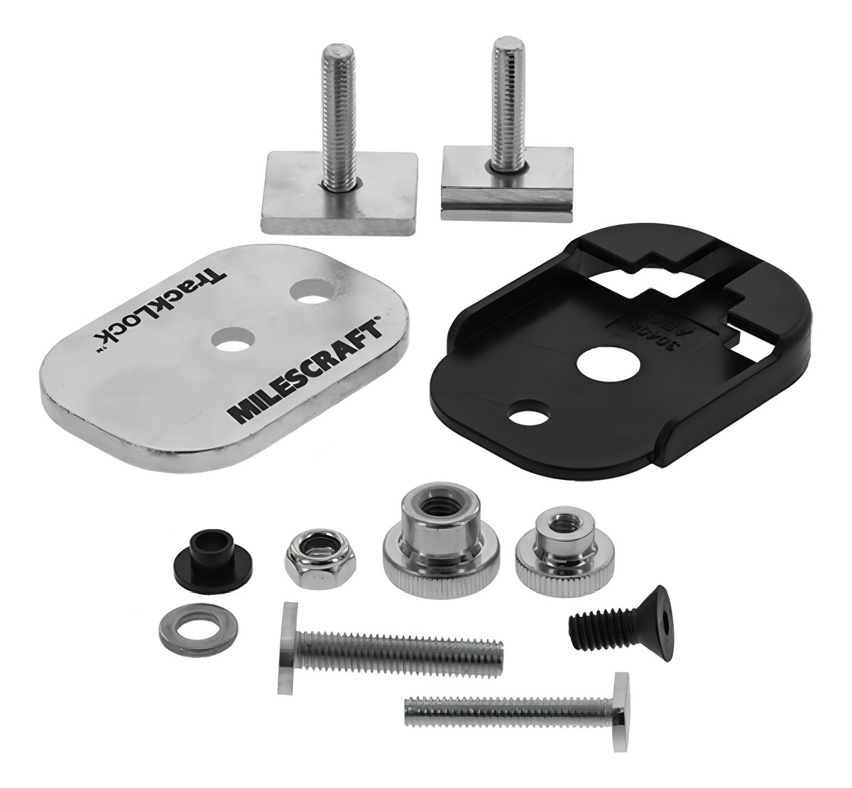 El kit de abrazaderas TrackMaster Universal T-Track incluye una abrazadera Milescraft de 3” y cuatro tamaños diferentes de pernos en T. Los pernos en T incluidos convierten rápidamente la abrazadera de banco de rieles en T de ¼” a rieles de 13 mm, 23 mm, 30 mm o 35 mm.