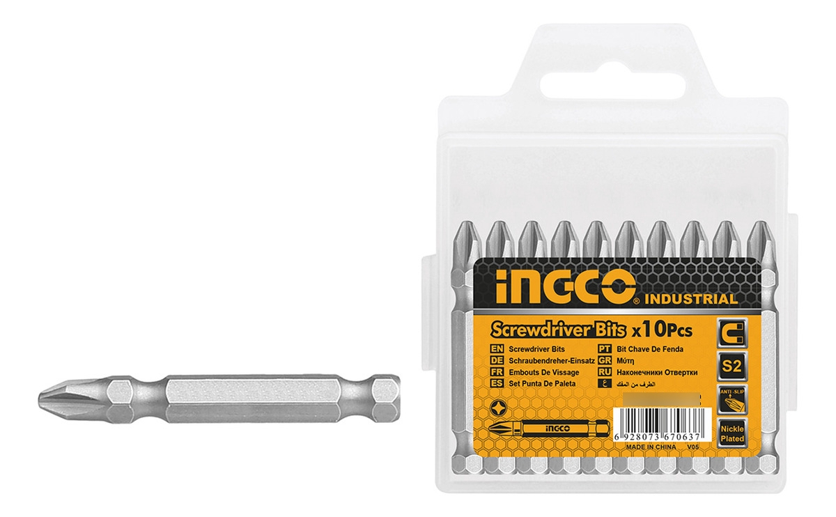 Descubre las Puntas X 10 para Atornillador Phillips PH2 de 50mm de la reconocida marca INGCO, modelo SDB11PH223. Este juego incluye 10 piezas de alta calidad, fabricadas en acero industrial S2, lo que garantiza una durabilidad excepcional y resistencia al desgaste. Cada punta cuenta con un acabado niquelado que no solo mejora su apariencia, sino que también proporciona una mayor protección contra la corrosión. Diseñadas específicamente para ofrecer un ajuste perfecto en tornillos Phillips, estas puntas son ideales para trabajos de precisión. Además, su diseño incluye una punta magnética, facilitando la manipulación y colocación de tornillos. El producto se presenta en un práctico embalaje de caja de plástico, asegurando que tus puntas se mantengan organizadas y protegidas. Perfectas para profesionales y aficionados al bricolaje, estas puntas son una herramienta esencial en cualquier caja de herramientas. ¡No te quedes sin ellas!