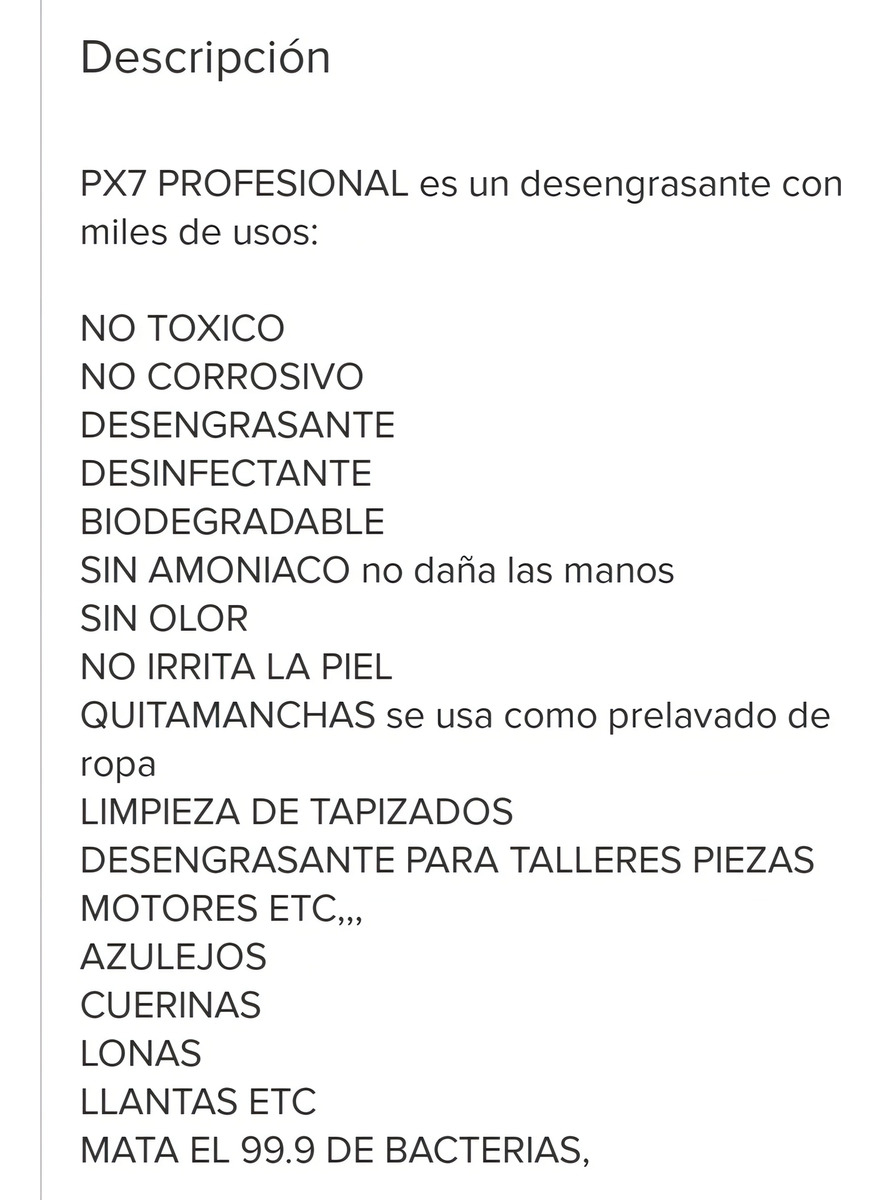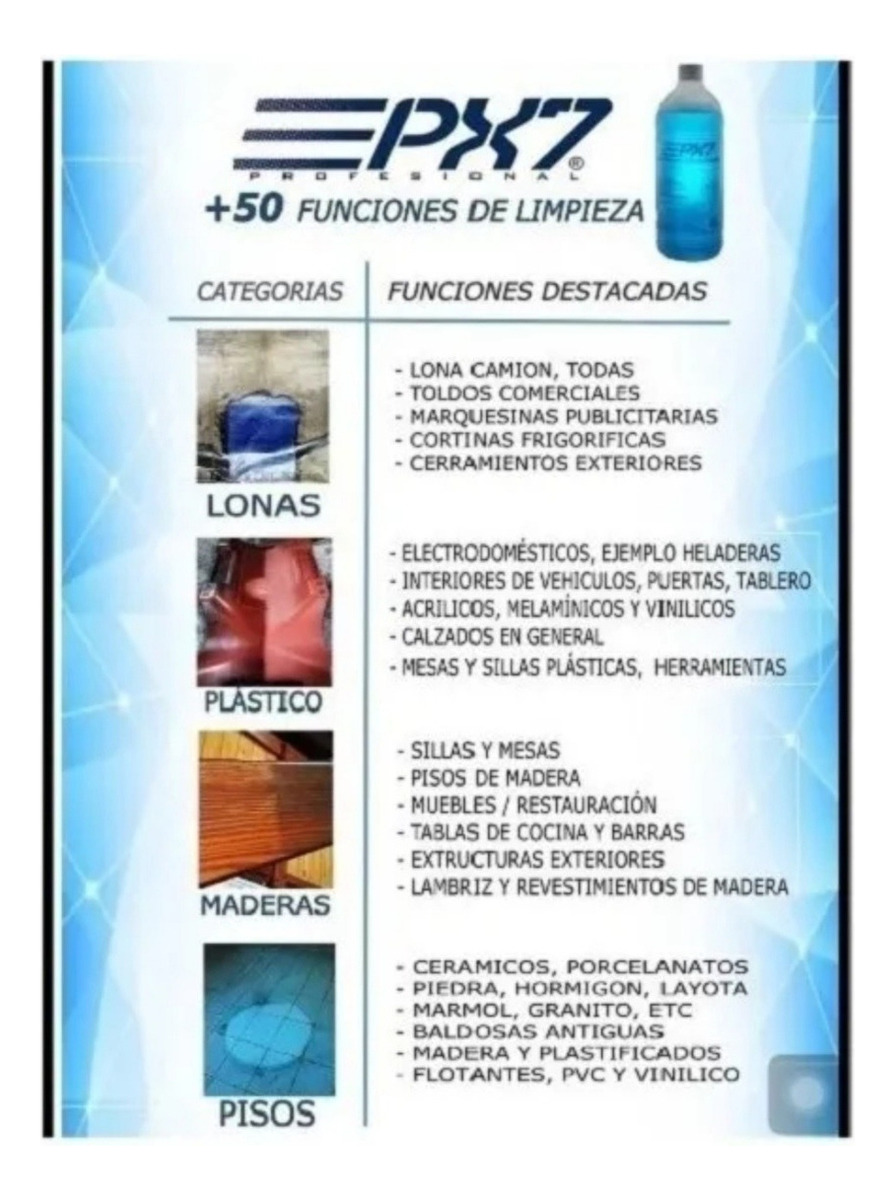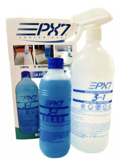 Px7 Multiuso es un detergente líquido concentrado, diseñado para desengrasar y desinfectar superficies lavables, cumpliendo con parámetros de limpieza y sanitización profesional, sin perjudicar la salud de los usuarios ni dañar el medioambiente. Es el primer limpiador ecológico en Uruguay.