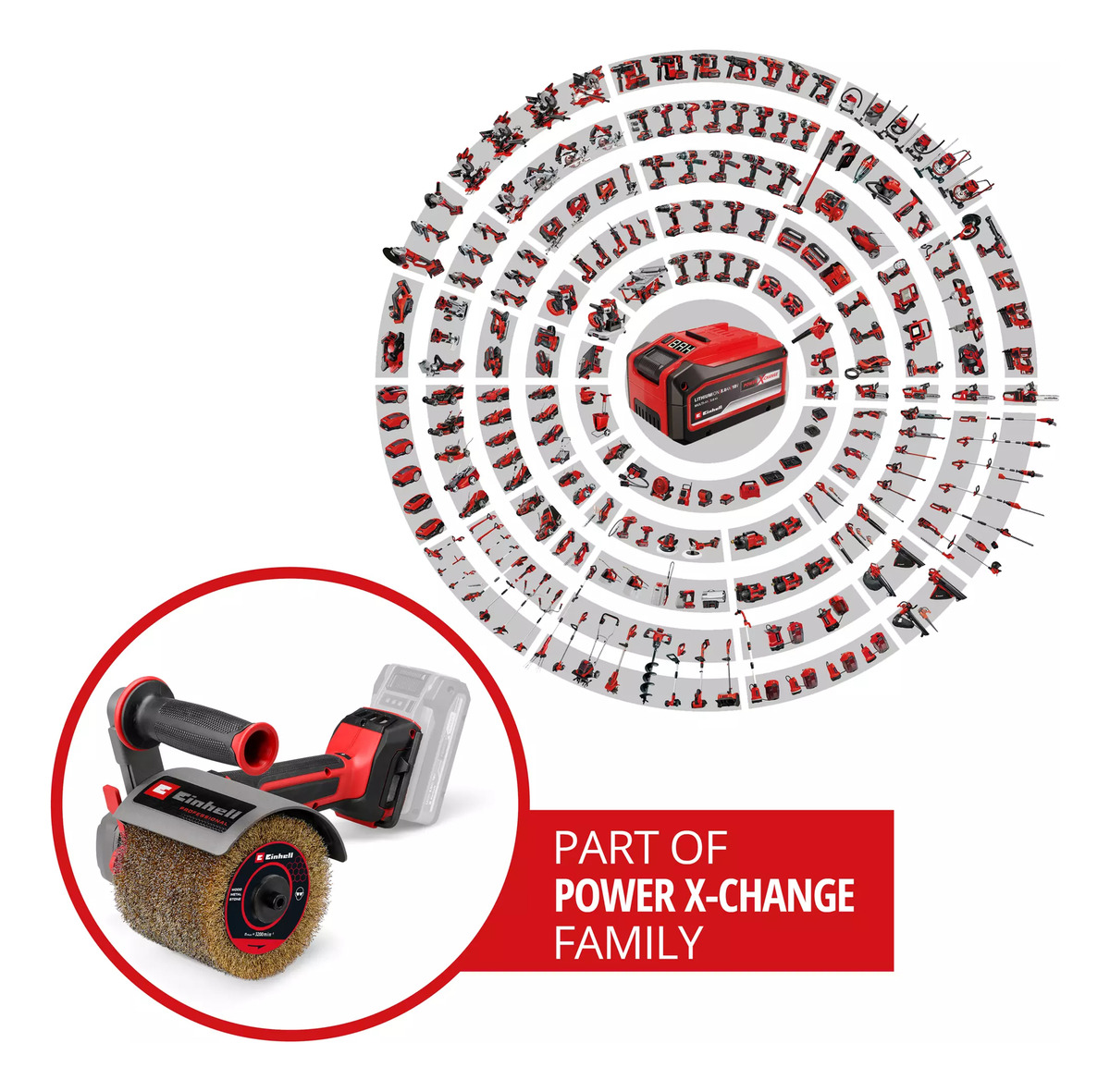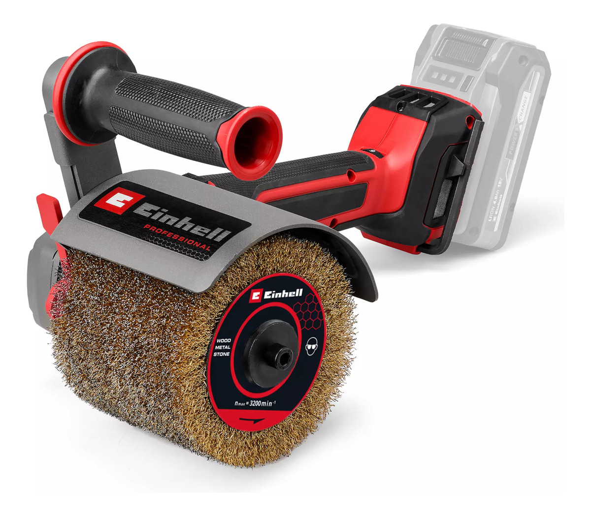 La lijadora de cepillo con batería TP-BR 18/32 Li B-Solo Einhell Professional es un equipo versátil para lijar, pulir, satinar y limpiar materiales como madera, metal o piedra. La lijadora universal con batería es parte de la familia Power X-Change y puede combinarse con todas las baterías y cargadores de la serie del sistema. El equipo se acciona por un motor Brushless de Einhell. Este motor sin escobillas ofrece más potencia y una vida útil más prolongada que los motores de escobillas de carbono convencionales. Tras un registro online se aplican 10 años de garantía en el motor Brushless. La lijadora de renovación se envía con un cepillo de alambres de latón de 100 mm de ancho con Ø 120 mm. Con este, por ejemplo, se puede limpiar el metal y la piedra insensible o refrescar y resaltar la veta de la madera. Otros cepillos, por ejemplo, de nailon, fibras sintéticas, tiras abrasivas o lamas de lijado, son adquiribles por separado. El cambio de cepillo se realiza por medio del botón de bloqueo y la llave Allen suministrada. Mediante la electrónica de velocidad, la potencia se puede adaptar al material respectivo y a la tarea, y el bloqueo de funcionamiento continuo facilita el trabajo que requiere mucho tiempo. Para el uso flexible desde diferentes posiciones de trabajo, la empuñadura adicional y la protección del cepillo se pueden ajustar sin herramientas. Gracias a su práctico diseño, la satinadora con batería también se puede trabajar cerca de los bordes. Las rejillas antipolvo integradas protegen el interior de la lijadora de cepillo de la suciedad y las rejillas se pueden quitar para facilitar la limpieza. La protección a reinicio y la protección a sobrecargas, que evita el sobrecalentamiento del motor, garantizan un uso duradero. Para el uso se necesita una batería Power X-Change de 18 V.