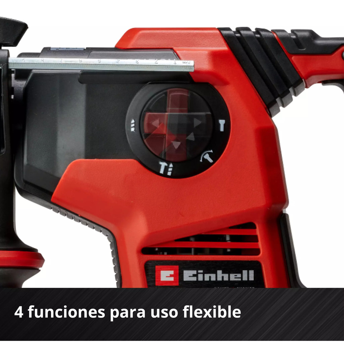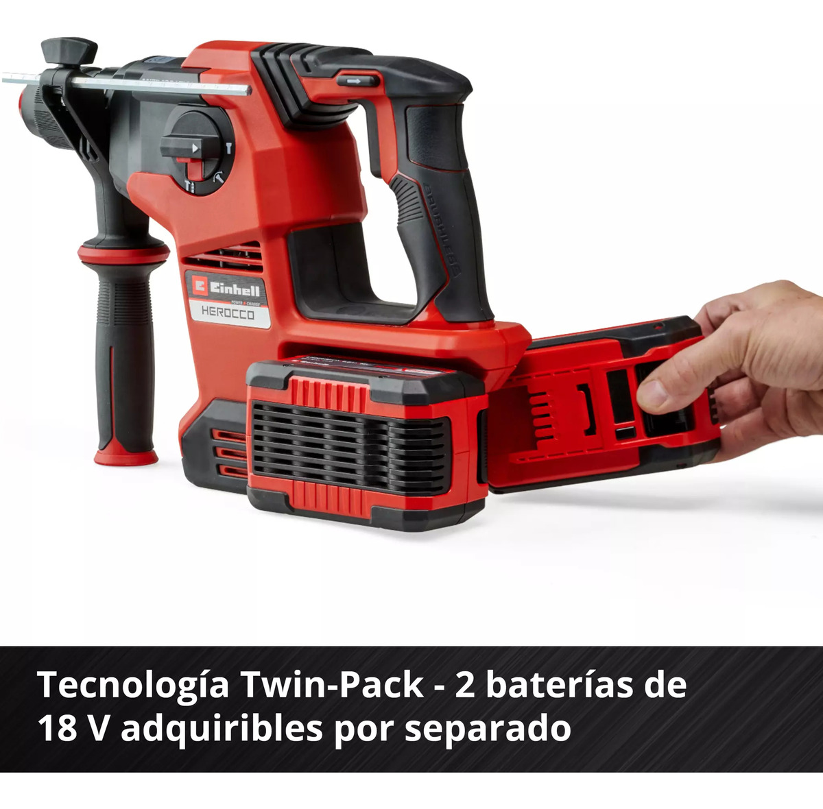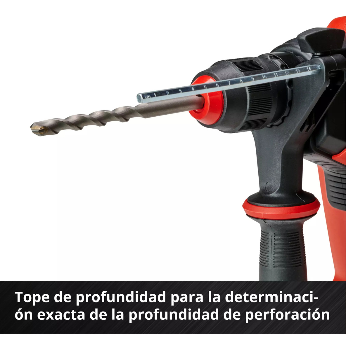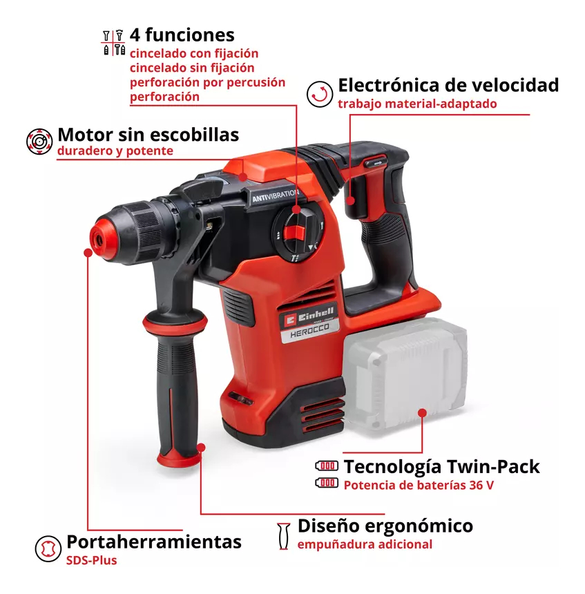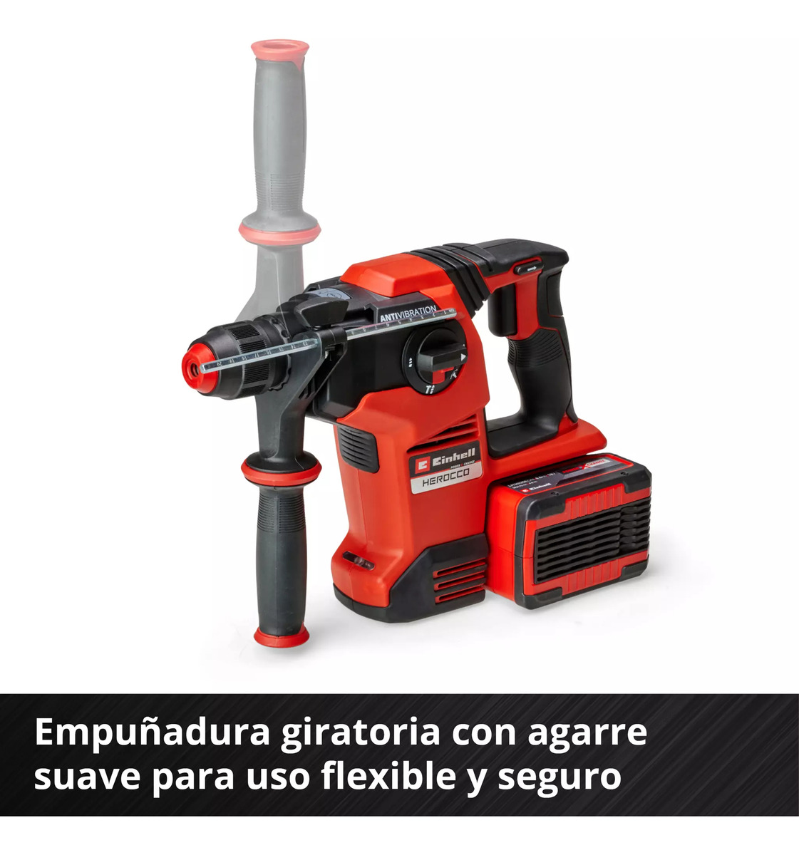 El martillo perforador sin cable Herocco 36/28 de Einhell es un potente ayudante en la obra, que combina 3,2 julios de potencia de impacto con una gran capacidad de perforación y la libertad de la tecnología sin cable. Como miembro de la serie Power-X-Change de Einhell, todas las baterías recargables de iones de litio de alta calidad de la serie pueden utilizarse en el martillo perforador. Con la tecnología TWIN-PACK el martillo perforador se alimenta de dos baterías recargables Power X-Change de 18 V, lo que significa: Más potencia para abordar los materiales táctiles. El martillo perforador combina cuatro funciones en una: Taladrar y taladrar por impacto y cincelar con y sin bloqueo. El motor sin escobillas proporciona más potencia y funciona durante más tiempo que un motor convencional de escobillas de carbón, sin ningún tipo de desgaste mecánico. El mecanismo de impacto neumático del martillo perforador facilita el trabajo de perforación continua en el hormigón. El martillo perforador está equipado con un portabrocas universal SDS-plus con función semiautomática, un sistema electrónico de precisión de la velocidad para un funcionamiento sensible a pesar de toda la potencia del martillo perforador y un tope de profundidad de perforación de metal macizo de ajuste continuo. Para una mayor comodidad de manejo, el martillo perforador sin cable dispone de un mango principal amortiguado para reducir las vibraciones durante el trabajo. Además, el martillo perforador dispone de un mango adicional con empuñadura suave y nervios para una sujeción segura, y para mayor seguridad del usuario hay un acoplamiento deslizante de sobrecarga. Para una visibilidad óptima en el área de trabajo, el martillo perforador cuenta con una luz LED. Para su funcionamiento se necesitan dos baterías recargables Power X-Change de 18 V. Para obtener resultados óptimos se recomienda utilizar baterías recargables de 3,0 Ah o superiores. El producto se suministra en un práctico maletín de transporte y almacenamiento E-Box.