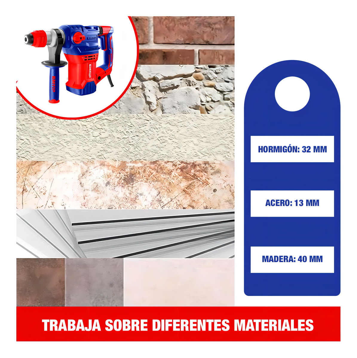 Este rotomartillo Emtop ERHRP1502 es lo que necesitás para encarar trabajos pesados, seas una persona aficionada o un profesional. Su funcionamiento es muy similar al de un taladro, solo que esta herramienta es más potente y permite trabajar en materiales más firmes.