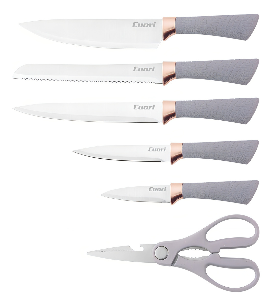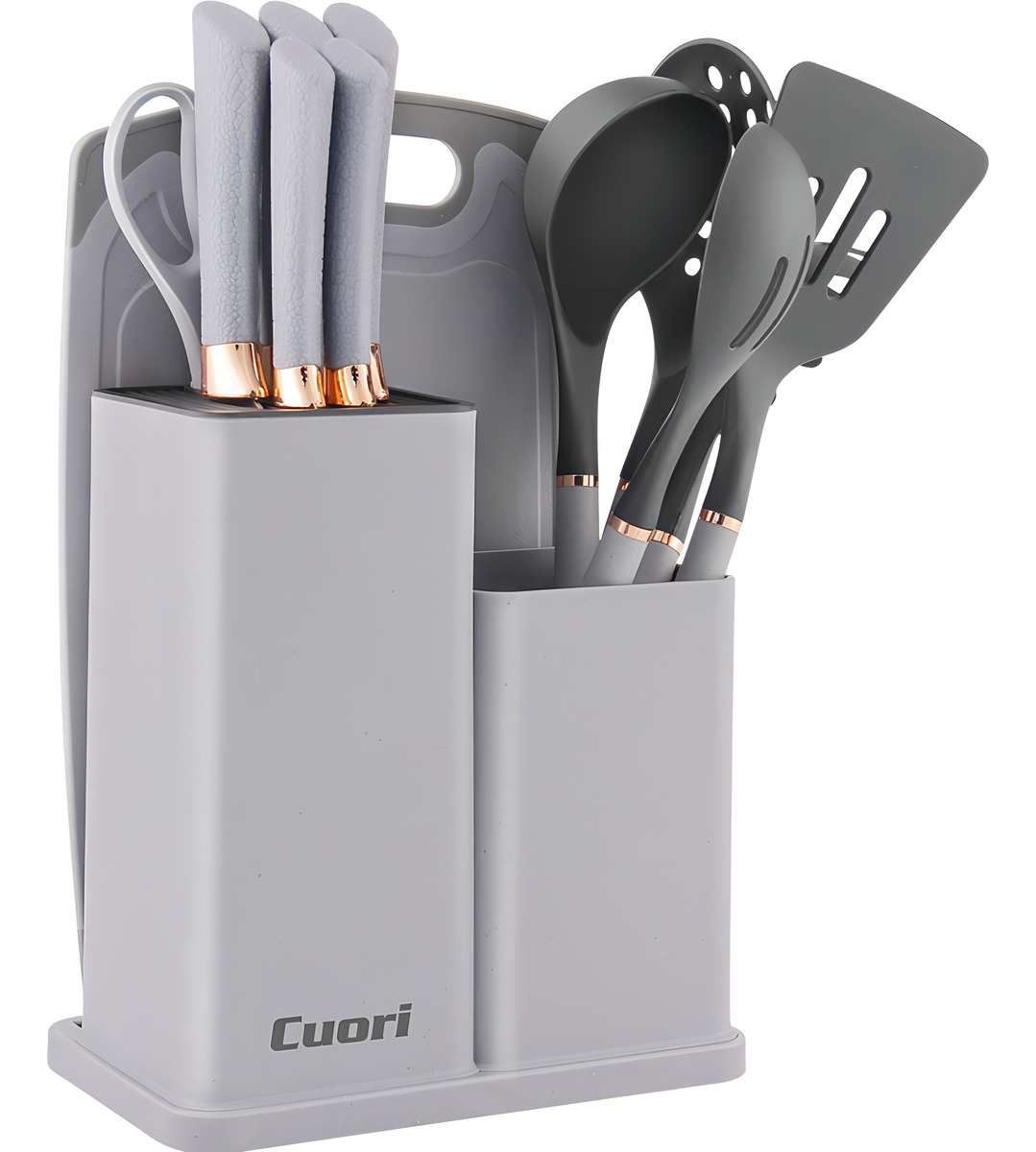 Descubre el Set 13 Piezas Juego De Cuchillos + Menaje Cuori, una solución completa para tus necesidades culinarias. Este set incluye 5 cuchillos de alta calidad, diseñados para facilitar la preparación de tus platillos favoritos, junto con una tijera y un set de 5 utensilios de menaje. La tabla para cortar y el soporte garantizan un espacio de trabajo ordenado y seguro. Las cuchillas están fabricadas en acero inoxidable, lo que asegura durabilidad y resistencia al desgaste. El mango ergonómico de plástico (PP) proporciona un agarre cómodo y seguro, mientras que los apliques cromados añaden un toque de elegancia. Este set es apto para lavavajillas, lo que facilita su limpieza. Con un total de 13 piezas, este modelo Nidia es ideal tanto para chefs aficionados como para cocineros experimentados. ¡Transforma tu cocina con Cuori!