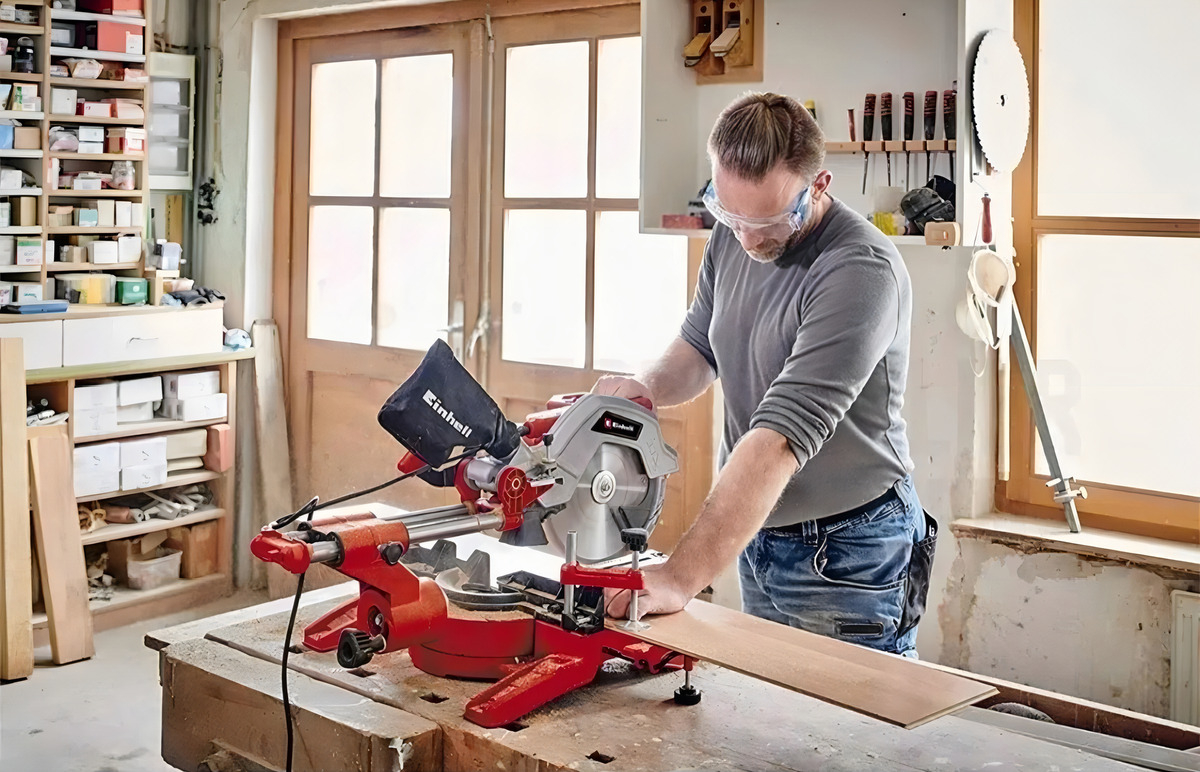 La cabeza de la sierra se inclina hacia la izquierda para cortes perfectos en inglete