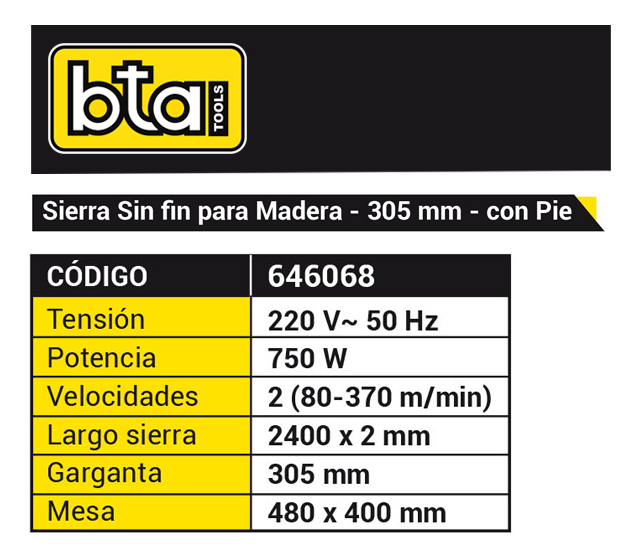 SIERRA SINFIN P/MADERA 305MM 2 VELOCIDADESSKU: 646068CATEGORÍAS: SIERRAS, Sin Fin para MaderaTensión: 220 V/50HzPotencia: 750 WVelocidades: 2 (370 – 80 m/min)Garganta: 305 mmMesa: 480 x 400 mmLargo hoja de sierra: 2400 mmUso: Profesional