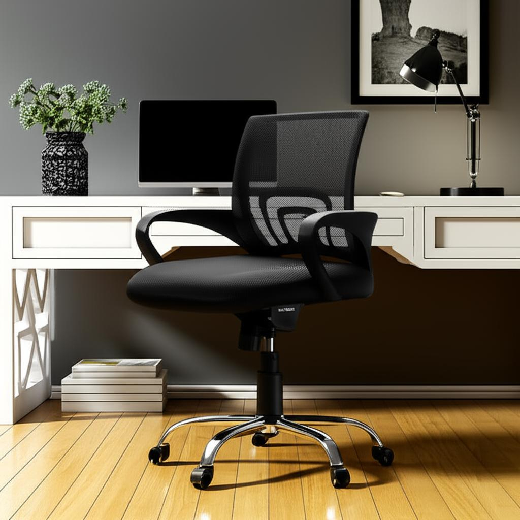 La Silla de Escritorio Negra Mesh con base cromada es la elección perfecta para quienes buscan comodidad y estilo en su espacio de trabajo. Con un diseño ergonómico, esta silla está diseñada para brindar soporte durante largas horas de uso. Su asiento y respaldo, con medidas de 48×48 cm y 48×45 cm respectivamente, se adaptan a diferentes posturas, mientras que su altura ajustable (85/95 cm) permite personalizar la experiencia. Además, cuenta con un respaldo reclinable que proporciona mayor confort. Fabricada con una estructura de plástico y un acabado cromado, esta silla es tanto moderna como duradera. Aunque requiere ensamblado, ofrecemos la opción de consultar por el costo de armado. Con ruedas para facilitar el movimiento y apoyabrazos fijos, es ideal para un entorno ejecutivo. Recuerda que las imágenes son ilustrativas y las medidas pueden variar ligeramente. ¡Transforma tu oficina con esta elegante y funcional silla!