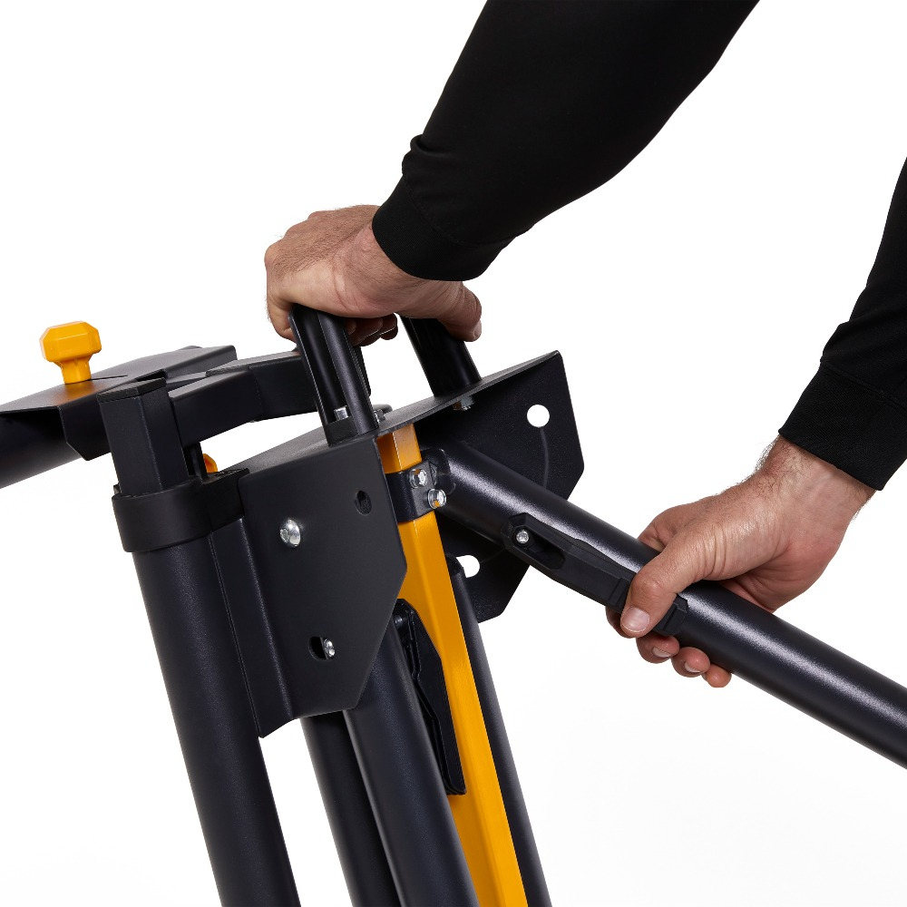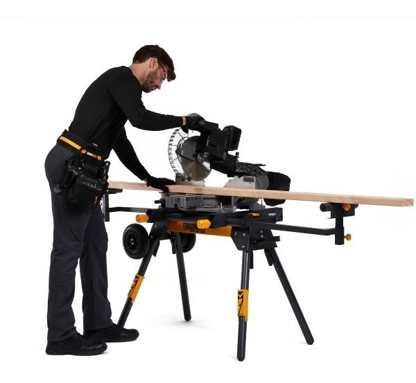 El soporte universal ToughBuilt® para sierra ingletadora universal (77″) de 195 cm, es uno de los soportes de trabajo más robustos del mercado actual. En su extensión máxima, mide 195 cm de largo (77 pulgadas de largo) y 73 cm de alto (29 pulgadas de alto), lo que le permite cortar material más largo sin arquearse. El soporte para sierra cuenta con 2 soportes de trabajo extensibles, 2 topes de trabajo, 2 portaherramientas de cierre rápido para sujetar varias herramientas sin esfuerzo y ruedas de goma maciza de 21 cm para transportar el soporte sin problemas a cualquier lugar. Además, las patas incluyen soportes de apoyo que permiten guardar los materiales del suelo de forma fácil y segura. Los neumáticos de caucho macizo de alta resistencia