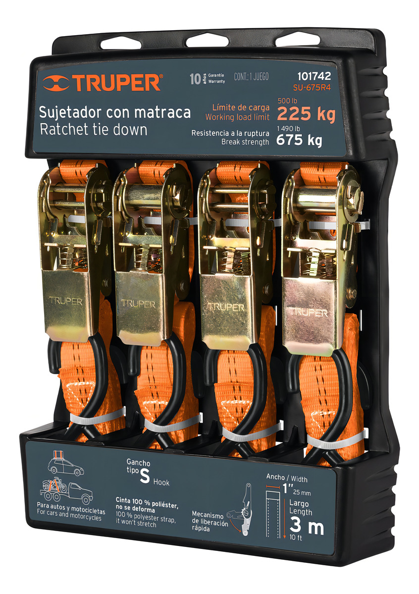 Sujetador Con Matraca 675 Kg 4 Piezas Truper 101742 Color Naranja’ es un juego de 4 sujetadores con matraca con una carga máxima de 675 kg. La cinta es 100% poliéster, lo que evita que se deforme. Cuenta con un gancho tipo S y un maneral metálico con recubrimiento tropicalizado resistente a la corrosión. Tiene un doble seguro de bloqueo que mantiene la matraca en posición cerrada. Es ideal para cargas ligeras, como autos y motos.