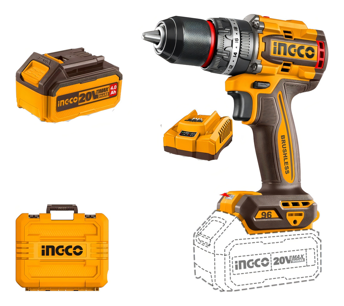 TALADRO ATORNILLADOR PERCUTOR A BATERÍA 20V P20S BRUSHLESS 96NM C/2BAT, CARGADOR, VALIJA Y ACCESORIOS