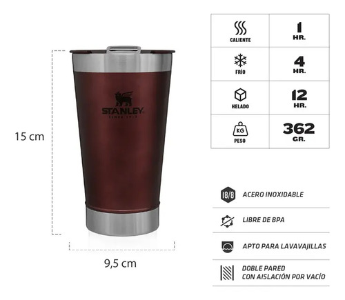 Descubre el vaso para cerveza Stanley Beer Pint, un accesorio ideal para disfrutar de tus bebidas favoritas en cualquier ocasión. Con una capacidad de 470 ml, su diseño en color bordó no solo es atractivo, sino que también es funcional, manteniendo tus cervezas frías hasta por 4 horas y las bebidas calientes por 1 hora.