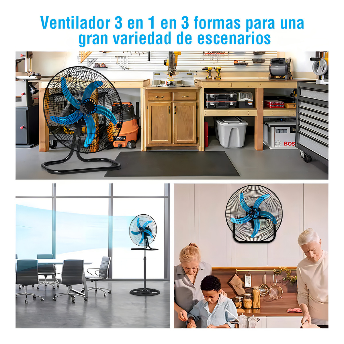 – Ventilador multipropósito con 3 modos de uso: pared, mesa, pie