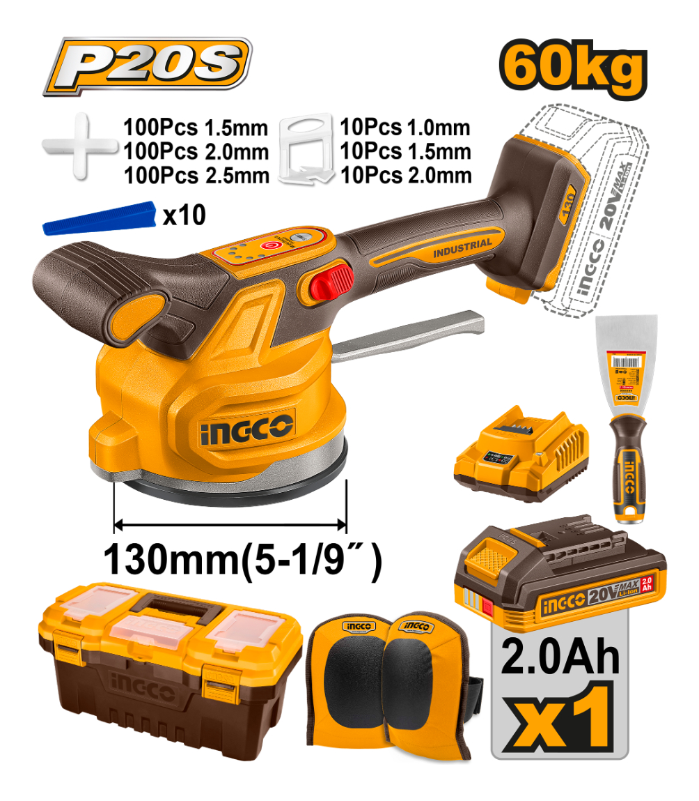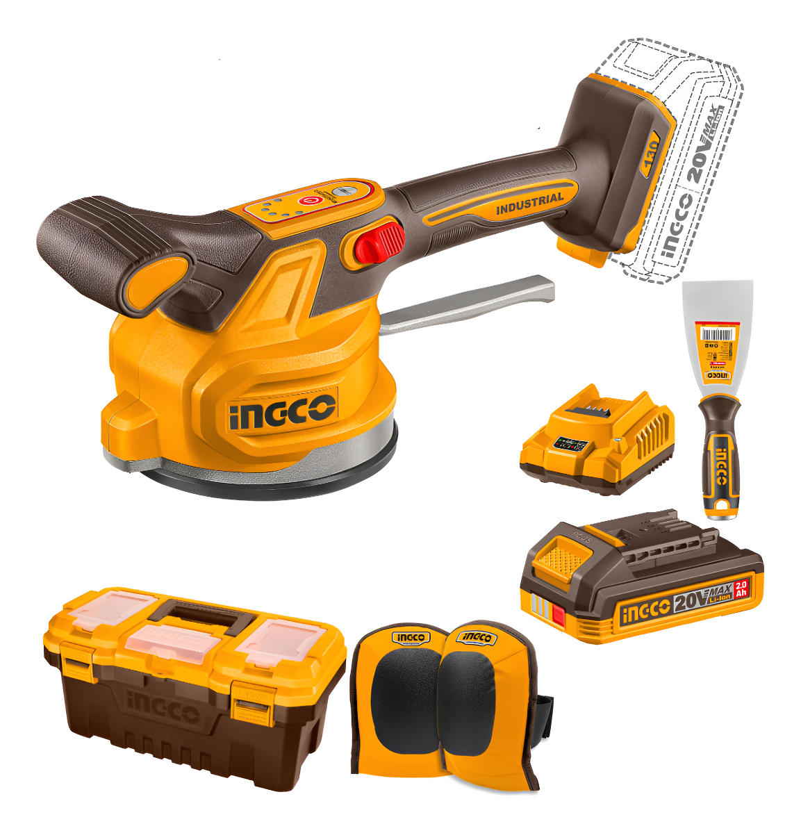 VENTOSA VIBRADORA A BATERIA P20S 20V PARA COLOCAR CERAMICA C/ BAT 2.0AH + CARGADOR + ACCESORIOS + CAJA PLASTICA INGCO CTVLI20018