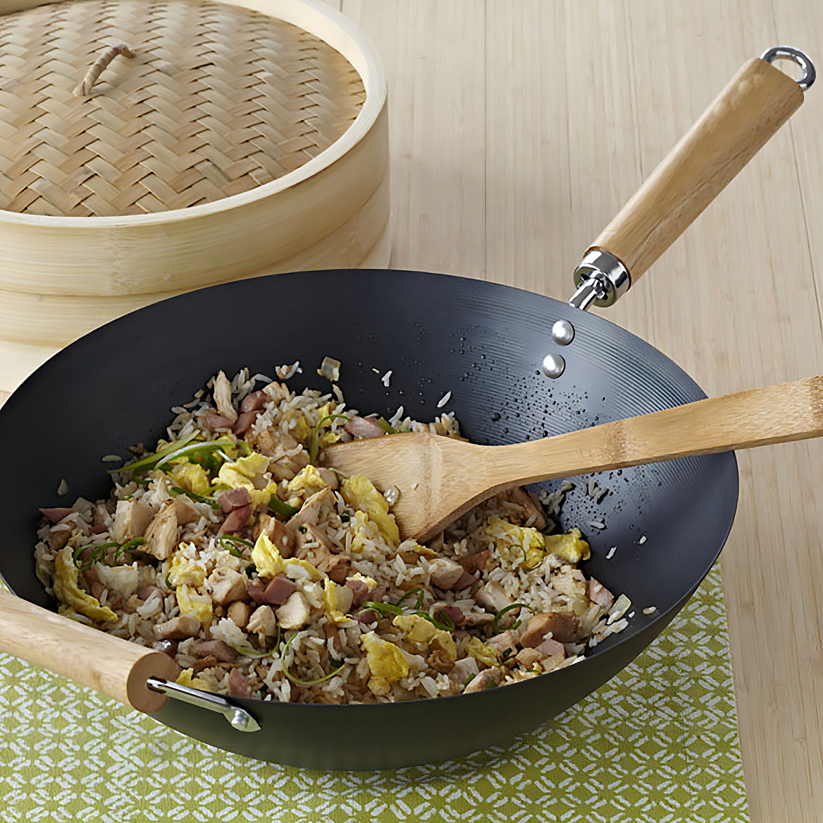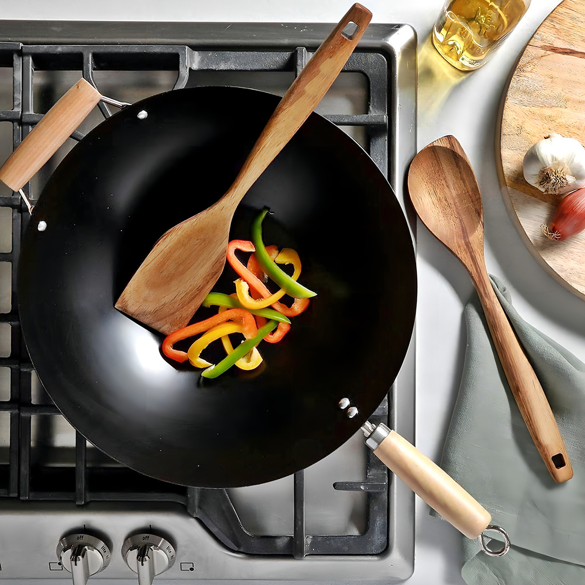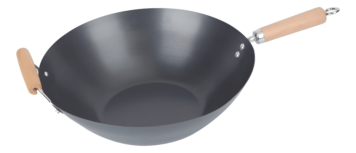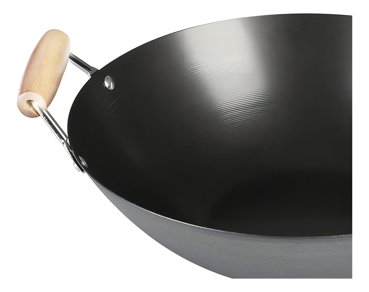 El contenido de la caja incluye un Wok de fondo plano de 35 cm hecho de acero al carbono de calibre pesado de 1.8 mm y asas de madera remachadas dobles.